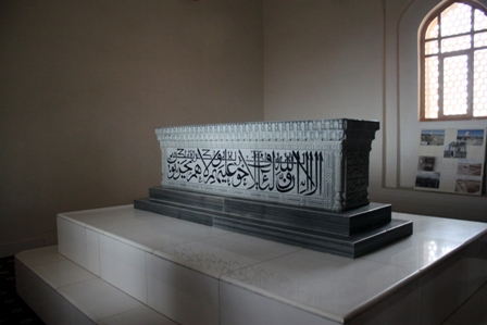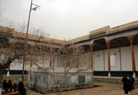 دورتادور محوطه آرامگاه را دیوار سپیدی پوشانده که دیدن قبور را غیرممکن میسازد. زائران روی صندلیهای پای دیوار، زیر درخت مینشینند و دعا میخوانند و برمیخیزند. عکاسی از آرامگاه هم بیاحترامی تلقی میشود. من هم این عکس را از دور گرفتم. موی اسبی که از تیرک چوبی تصویر آویزان است، نشان طریقت نقشبندی است.