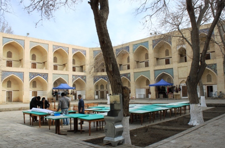 حجرهها در حال حاضر، به غرفه های فروش صنایع دستی یا محل کار هنرمندان تبدیل شدهاند. در فصول گرم سال، در حیاط رستورانی برپا میگردد. اولین برخورد ما با مردم بخارا همین جا شکل گرفت. بیشتر مردم بخارا و سمرقند تاجیکی هستند و فارسی صحبت میکنند. وقتی ایرانی ببینند، با تعجب و خوشحالی میگویند: «شما تاجیکی میدانید!» خب! در پاسخ یکی دو نفر اول ممکن است وسوسه شوید اشتباهشان را اصلاح کنید اما، خیلی زود متوجه میشوید سطح ناآگاهی مردم در مورد ریشههایشان و زبانی که به آن سخن میگویند، عمیقتر از این حرفهاست که یک گردشگر بخواهد در جهت اصلاح آن قدمی بردارد.