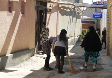 اینجا یک مکتب است. اغلب، بانوان جلوی خانه، مدرسه یا محیط کارشان را تمیز میکنند.