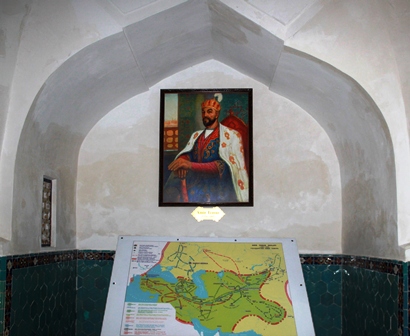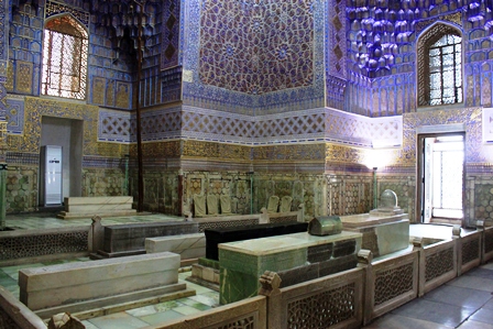 بگذریم؛ قدری از بنای باشکوه آرامگاه بگوییم که اثر تحسینبرانگیز یک معمار ایرانی است؛ استاد محمد بن محمود بنا اصفهانی... گنبد از بیرون با طرح پرکاری از کاشیکاری آبی و از درون با نقوش زیبای آبی و طلایی تزئین شده است. برای تزئین نمای داخلی، حدود دو و نیم کیلوگرم طلا به کار رفته است. وارد بنا شدیم. در سرسرای ورودی، تصویر تیمور لنگ بر دیوار و نقشه کشورگشائیهایش هم زیر پاهایش قرار گرفته بود. تزئینات داخلی بنا که پانصد و اندی سال قدمت دارد، آبی و طلایی و بسیار باشکوه است. سقف و دیوارها پر است از آیات قرآن به خطی به غایت زیبا چنانکه رنگ طلاییشان با نورپردازی خوب بر روی کاشیهای آبی به طرز نفسگیری میدرخشد. از روی تابلوی راهنما، آرامگاه شاهرخ میرزا و الغبیگ را پیدا و ادای احترام کردیم. ناگفته نماند، تمامی گورها، در سردابه زیرین بنا قرار دارند و سنگ قبرهای مرمرین بالا، نمادین هستند. از خانواده تیمور، عبدالله میرزا، عبدالرحمن میرزا و میرانشاه هم اینجا آرمیدهاند. به جز گورکانیها، دو عارف هم اینجا به خاک سپرده شدهاند؛ میر سید برکت بالای سر امیر تیمور آرام گرفته است. او معلم امیر بوده و ظاهرا تیمور وصیت کرده بود پایین پای او دفن شود؛ به همین جهت جسد سید برکت را به این آرامگاه منتقل کرده و دوباره به خاک سپردند. شیخ عمر – فرزند سید امیر کلال- که پیر و مراد تیمور بود نیز، در گوشه سمت چپ آرمیده و برفراز آرامگاهش یک تیر چوبی بلند قرار گرفته که ظاهرا دسته موی اسبی از آن آویزان کردهاند؛ به نشان طریقت نقشبندیه... برخلاف سنگهای سپید مجموعه، گور امیر، سنگی سیاه دارد! گویی نادانسته و ناخواسته سیاهی قلبش را در میان جمع برجسته کرده باشند!