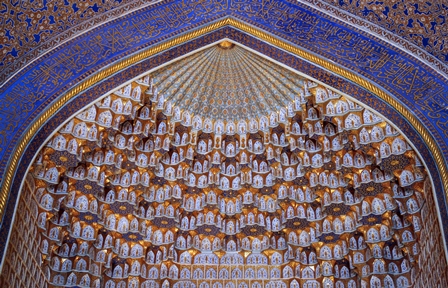 نوبت دیدن مدرسه طلاكاری شد که به دستور حاكم سمرقند ساخته شده است. وجه تسمیهاش از آنروست که با آب طلا تذهیب گشته است. مدرسه یک گنبد فیروزهای دارد که برخلاف عرف، در سمت چپ بنا واقع گردیده است. اینجا حکم مسجد جامع شهر را داشته و برای خواندن نماز جمعه از آن استفاده میکردهاند. یک محراب خیرهکننده و منبری سنگی دارد. روسها در سال 1961 طلاهای مدرسه را غارت کردند و در زمان بازسازی فقط 1300 گرم از طلاها را پس دادند...