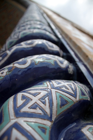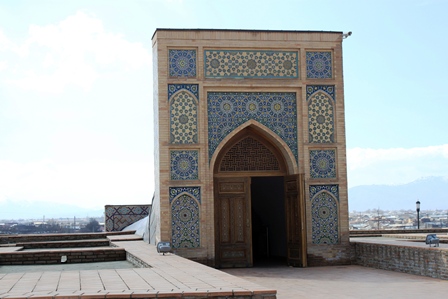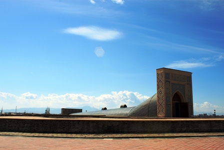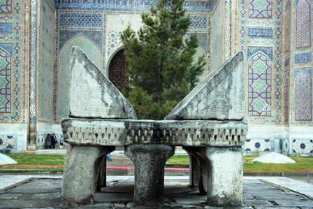 رصدخانه، در شمال شهر سمرقند روی تپهای واقع گردیده است. الغبیگ، دستور ساخت آن را داده و مدیریت رصدخانه را به ملا علی قوشچی سپرد؛ مسئولیتی که تا کشته شدن الغبیگ به دست پسرش، بر عهده ملا باقی بود. بعدها رصدخانه تخریب شد و از دیدهها پنهان گشت تا آنکه توسط ویاتکین، باستانشناس سمرقندی در اوائل قرن بیستم، کشف و حفاری شد. از ساختمان بزرگ و مدور سه طبقه، تنها یک دالان به عمق تقریبی 10 متر و شعاع 40 متر باقی است که ریلی سنگی را درون خود جای داده، در میان این ریل، ابزار رصد را حرکت میدادهاند. در دو سوی ریل و میان آن نیز، سه ردیف پله تعبیه شده است. علت اشتهار رصدخانه، کتاب زیج الغبیگ است که حاوی مشخصات 1018 ستاره است. زیج یا زیگ، به مجموعه جداولی گفته میشود که موقعیت ستارهها و سیارهها را نشان میدهد. اطلاعات طلوع و غروب خورشید، ماه و دیگر سیارهها در روزهای مختلف سال در یک محل خاص نیز، در آن ثبت میگردد. زیج برای تهیه تقویم، تعیین روز و شب، مسیریابی و طالعبینی کاربرد داشته است. وارد موزه شدیم. چند ماکت از شکل اصلی رصدخانه وجود داشت که ابهتش تعجببرانگیز بود. یک ماکت از آکسارای، کاخ زیبا و تخریب شده شهرسبز و یک کاشی طلاکوب آن هم به چشم میخورد. برای ما که روز پیش، باقیمانده بنای آکسارای را به چشم دیده بودیم، تجسم شکل واقعی و کامل آن تکاندهنده بود! باقی آثار موزه، زیجها و اسطرلابهای قدیمی بودند. جز اینها، یک خطاطی بسیار زیبا از بایسنقرمیرزا و یک وقفنامه از دوره تیمور و ظفرنامه – اثر شرفالدین علی یزدی - هم در آثار نمایش داده شده قرار داشتند.