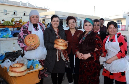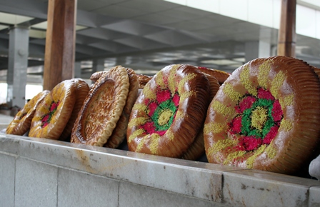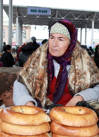 نان در آسیای میانه حرمت بسیاری دارد. بیش از فقط یک غذاست و باعث افزایش رزق و برکت تلقی میگردد. برای حرمت گذاشتن به آن، از کارد برای بریدنش بهره نمیبرند و نان را با دست تکه میکنند. اصطلاح نان شکستن از همین جا میآید. نان آن قدر عزیز است که در مراسم ازدواج، هنگام خطبه عقد و دعا برای سپیدبختی عروس و داماد توسط بزرگان دو خانواده شکسته میشود. شاخصترین، خوشخوراکترین و خوشروترین نان آسیای میانه، نان سمرقندی ست. نان سمرقندی، گرد و حجیم و میان آن گود است و سطح تو رفتگی را با قلمهای مخصوصی طرح میاندازند و بر آنها سیاه دانه میپاشند. مردم سمرقند، علاقه عجیبی به نان شهر خودشان دارند. ظاهرا خوردن غذا بدون نان سمرقندی برایشان معنا ندارد. در راه بازگشت از شهرسبز، مسافران همراهمان که با هواپیما عازم مسکو بودند، ماشین را نگه داشتند تا نان بخرند و همراه خود به مسکو ببرند!