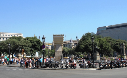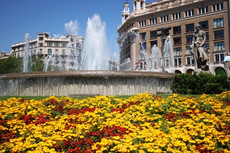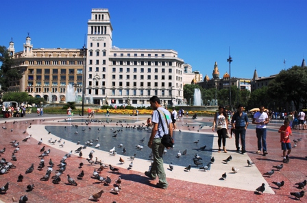 میدان کاتالونیا – سمت راست تصویر، جلوی آن ساختمان بلند یک زیر گذر هست که شما را به مرکز اطلاعات گردشگری در زیر میدان می رساند.
